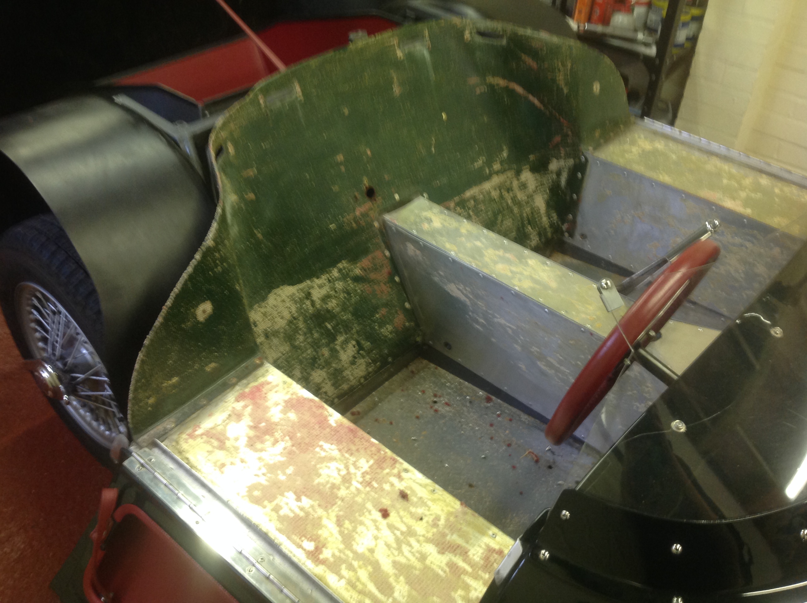 The floors, passenger footboard, sills, handbrake mechanism and gear lever surround are ribbed-rubber matting from Woolies, held down (and easily removable) with press studs: