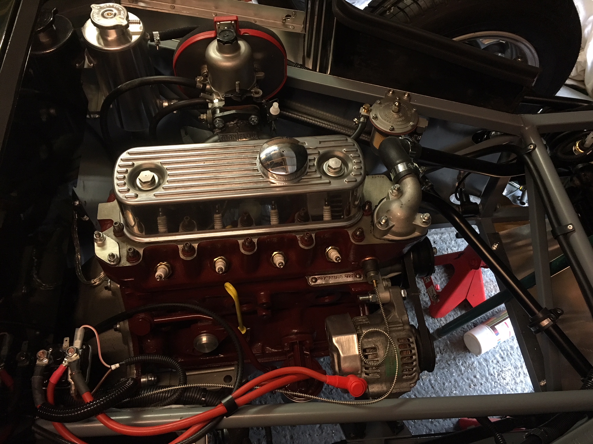There is at least an inch of space for the installation, maybe more. Plenty. This was a lot easier to fit in the chassis than the old Lucas and required about 15 minutes to do the hand filing. With the turnbuckle, it is very easy to do the belt adjustment as the tension can be set with fingers (left and right hand threaded hex and rod ends) and then the jam nuts are tightened. I recall that I ordered my hex adjuster, jam nuts and the rod ends from a UK race supplier at a very reasonable cost.