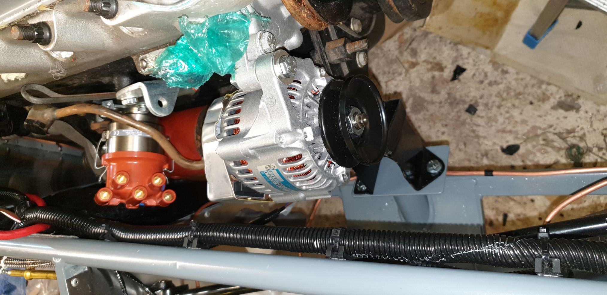 This also eliminates the back alternator bracket from the engine block and the through bolt. The short alternator also cleans up the cold side of the engine, making maintenance a little easier. The little alternator also saves a Kg or so.