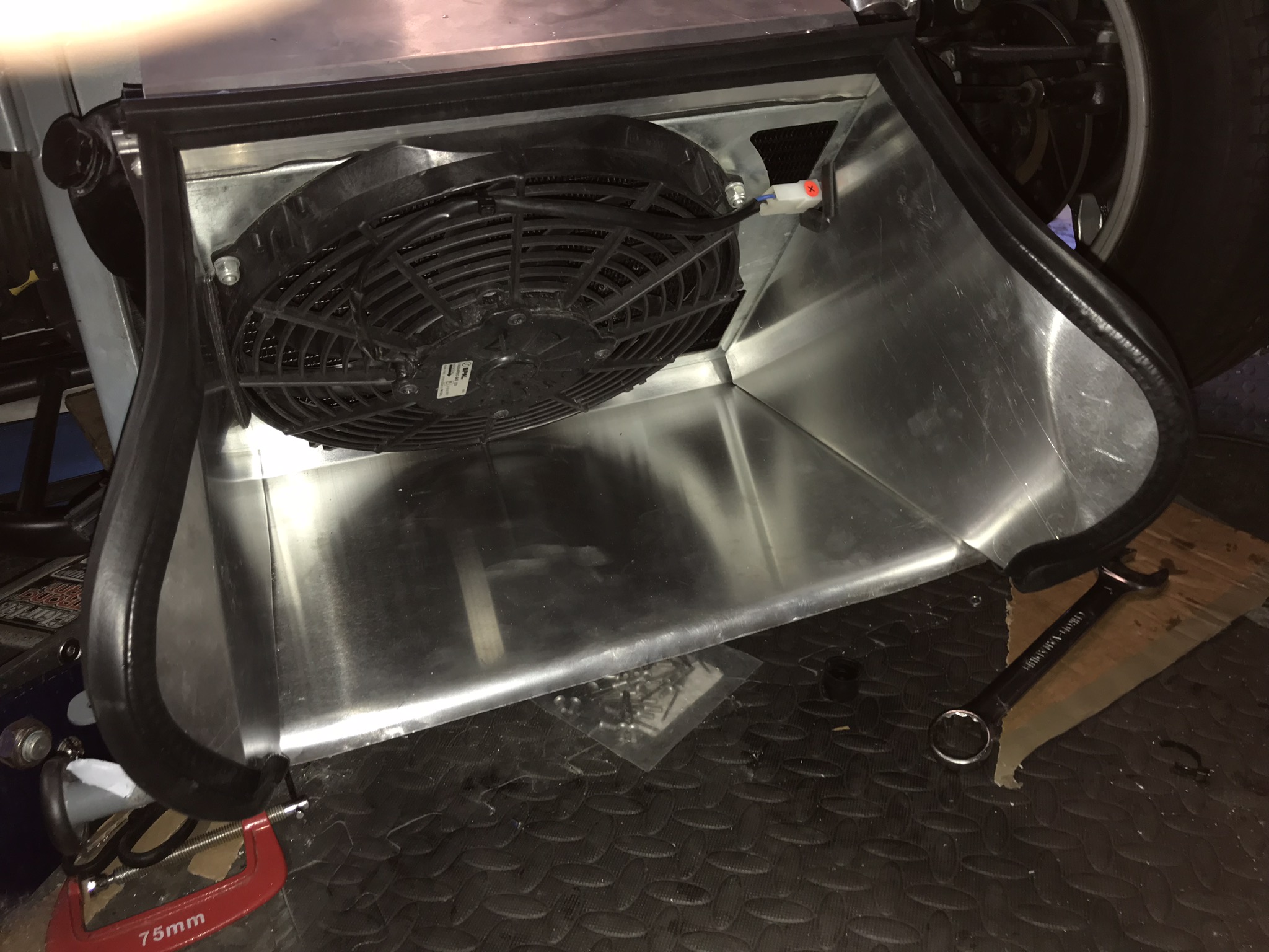 I didn't fit the shroud during the build after reading comments about the problems it caused. The fan is mounted directly on the rad, but I think the cure is to build the ducting around the rad. I will leave the fitting of that until after the IVA is complete.