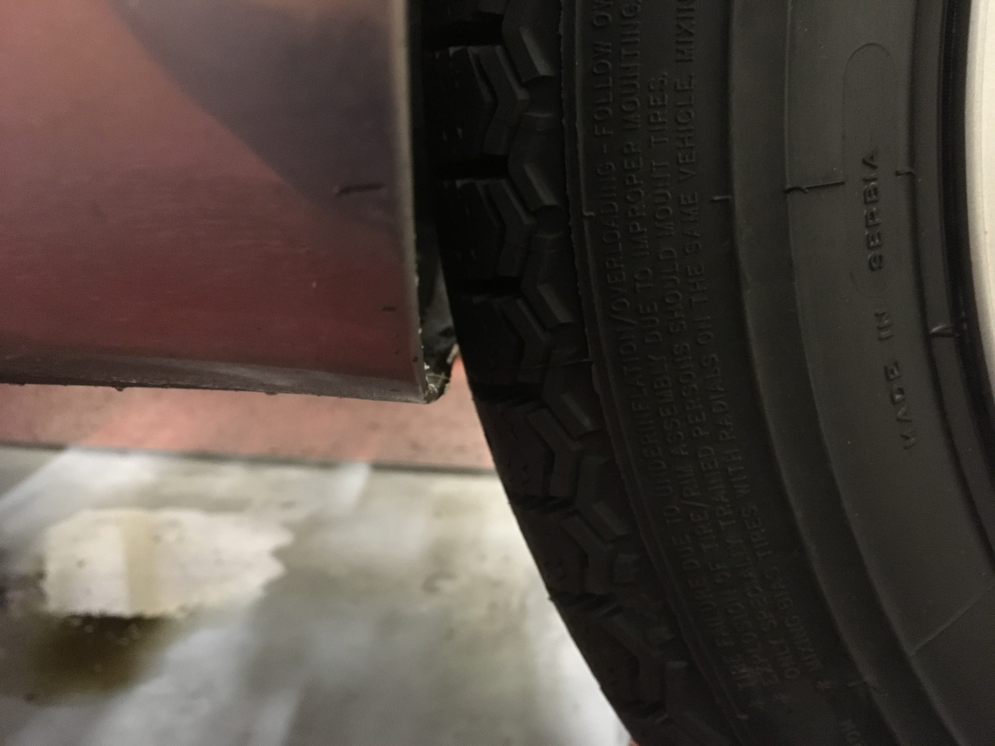 The pictures show a typical clearance with a 155 tire when the wheels are at full droop. BTW, a 165/13 can have the same problem at full droop. It can be tricky to remove a front tire when the car is jacked up with 13, 14., or 15" wheels.