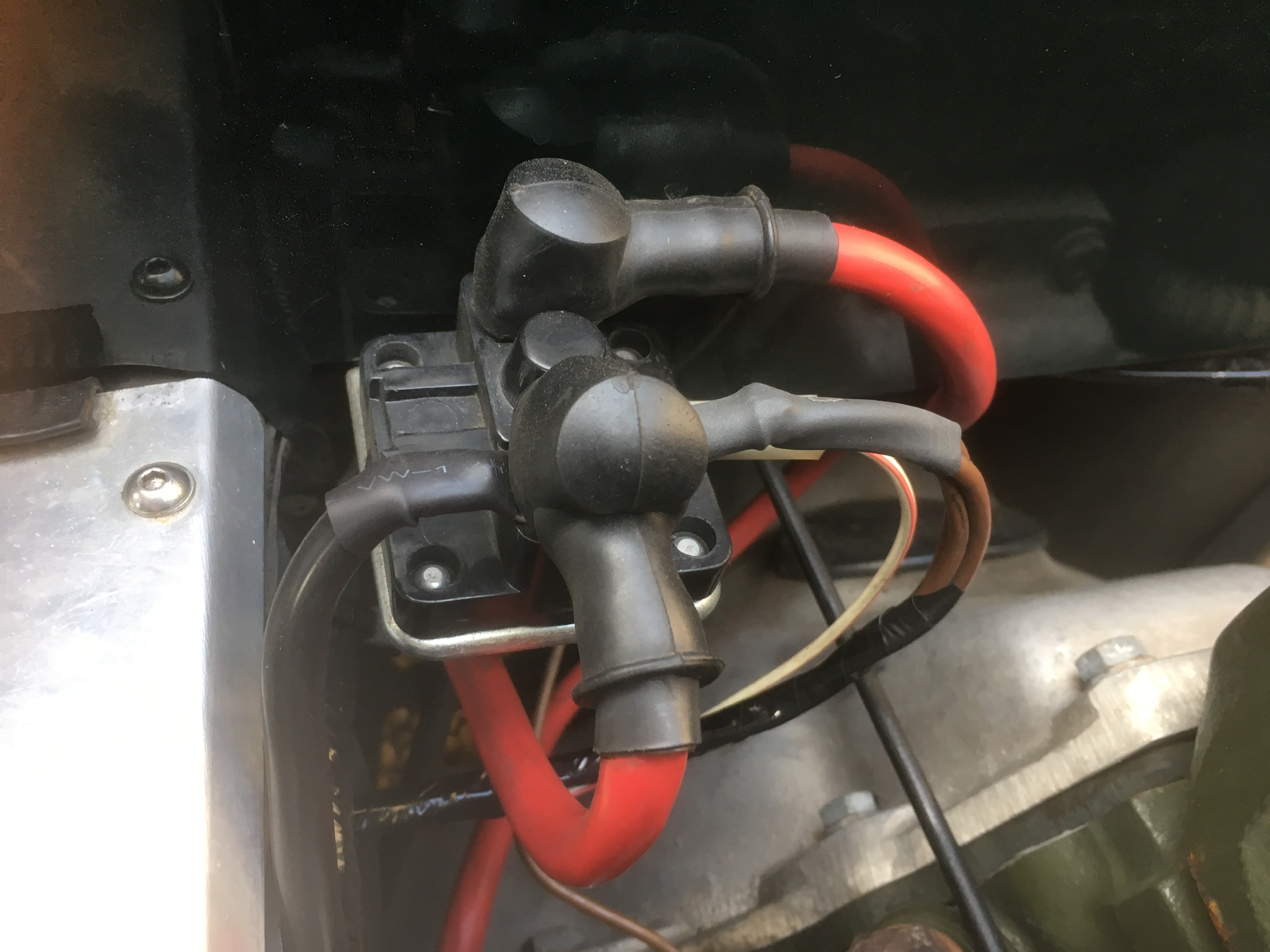 So now BOTH brown wires to the alternator are redundant and a switched-live feed has to be installed. I effected this by firstly unwrapping the loom from the alternator to the scuttle. The permanent-live feeds to the alternator, ignition switch and fuse box are all crimped into a single connector attached to the starter solenoid. I removed the heat-shrink from this connector, cut the two redundant brown wires to the alternator away (being careful to leave the wiring strands into the crimping intact, so that the crimp remains tight) and then reapplied heat-shrink over the three remaining 27A cables.
