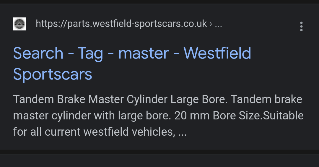As to the master cylinder type, the Westfield pick list describes it as a 'large bore' tandem master cylinder. Hopefully the actual bore size will be marked on the casting so I'll take a look.