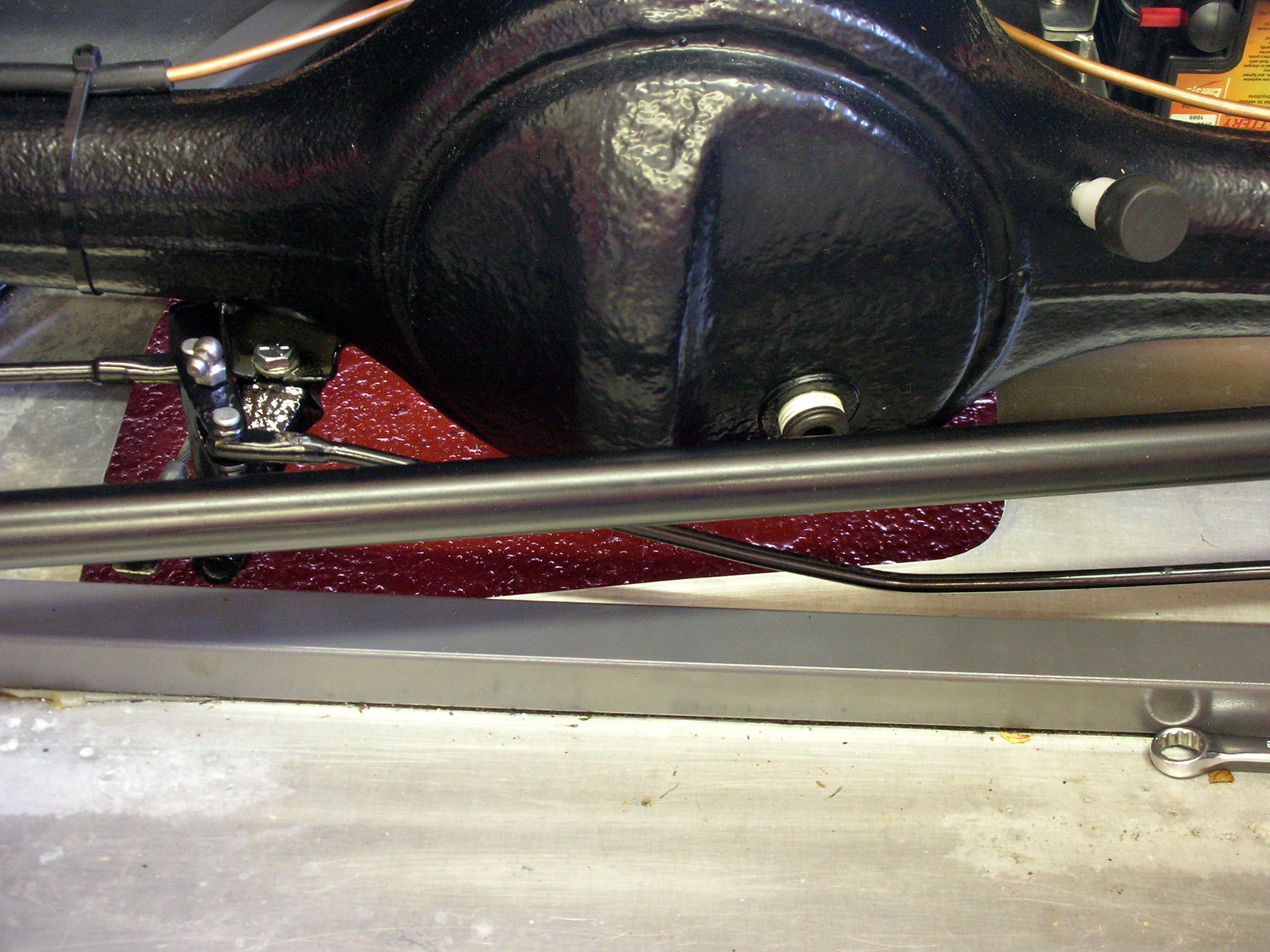 The rod can be bent forward slightly, crossing the Panhard Rod closer to the pivot at the axle. This eliminates any possibility of the rod touching the bar, as the brake rod and bar move together. You can put the bend starting about an inch from the attach point on the brake lever.