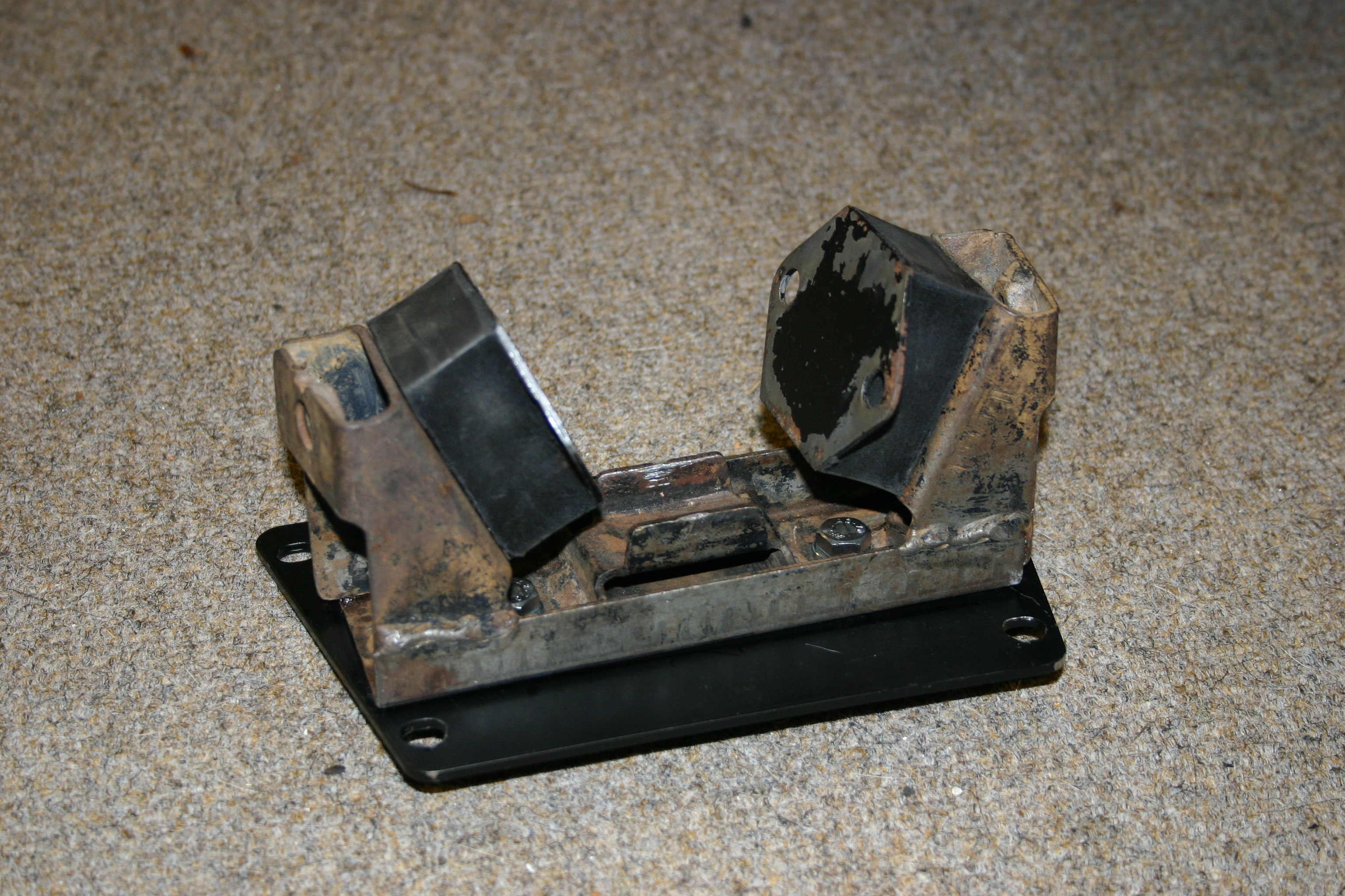 I have found a picture of the gearbox mount on the plate just prior to painting and then installing it. I fitted it after installing the engine and box as found it was easier to lift the back of the engine then bolt the plate with the mount already fitted to the chassis then lower the gearbox down and bolt it all up. It was fiddly very painful and helps if you have child sized hands and I did lots of measuring and card templates to get it just right but it does what it needs too once in place.