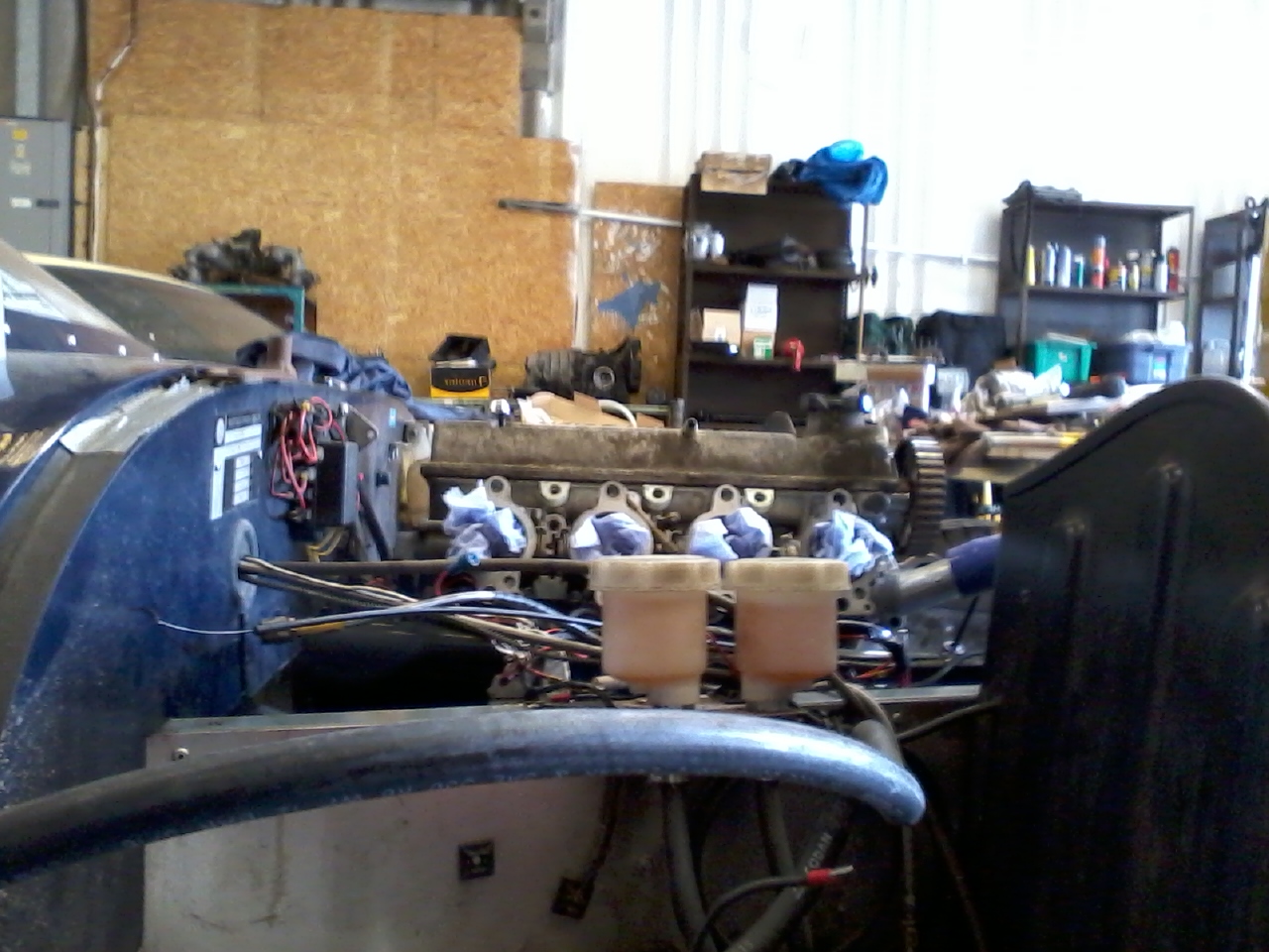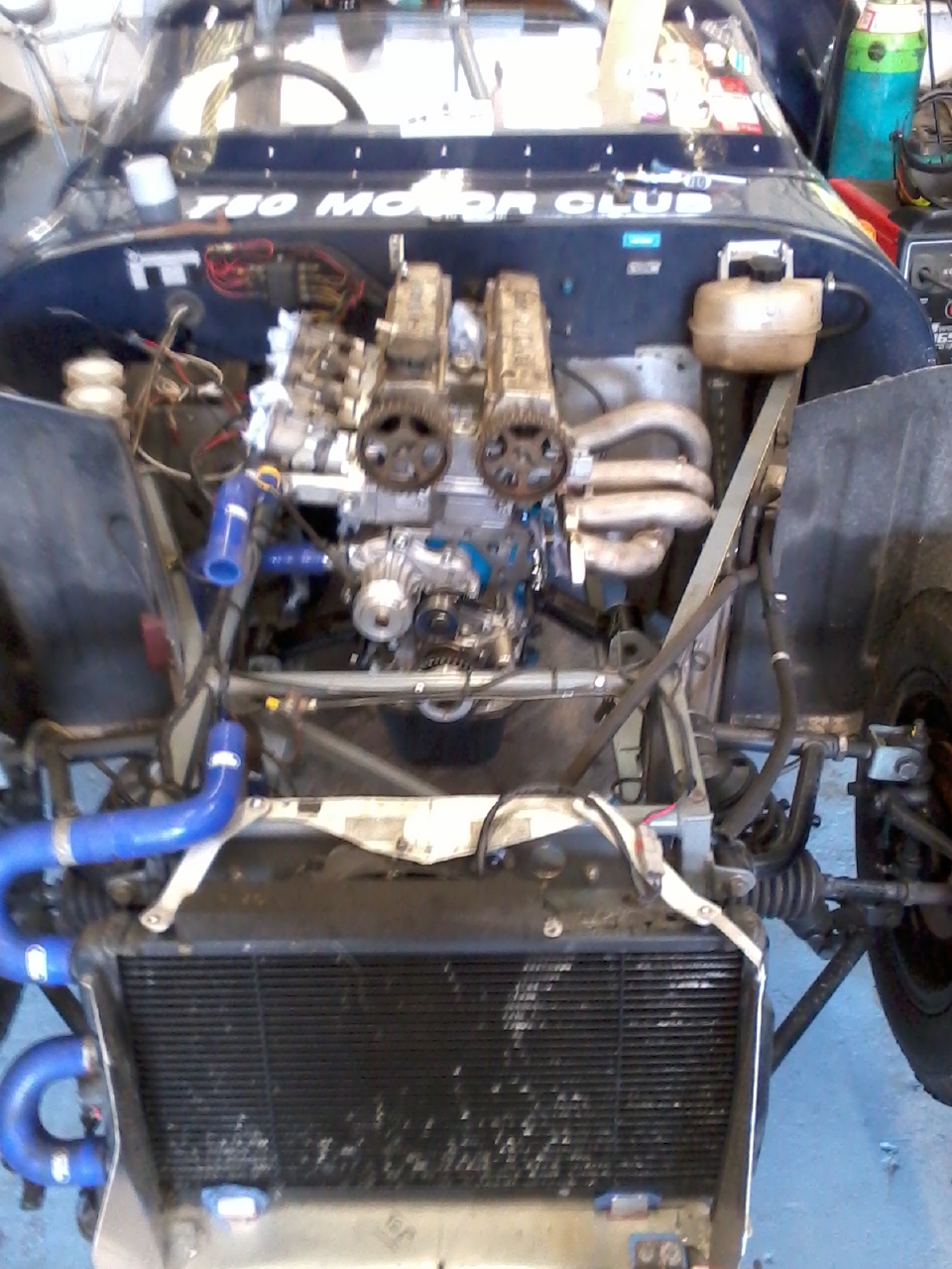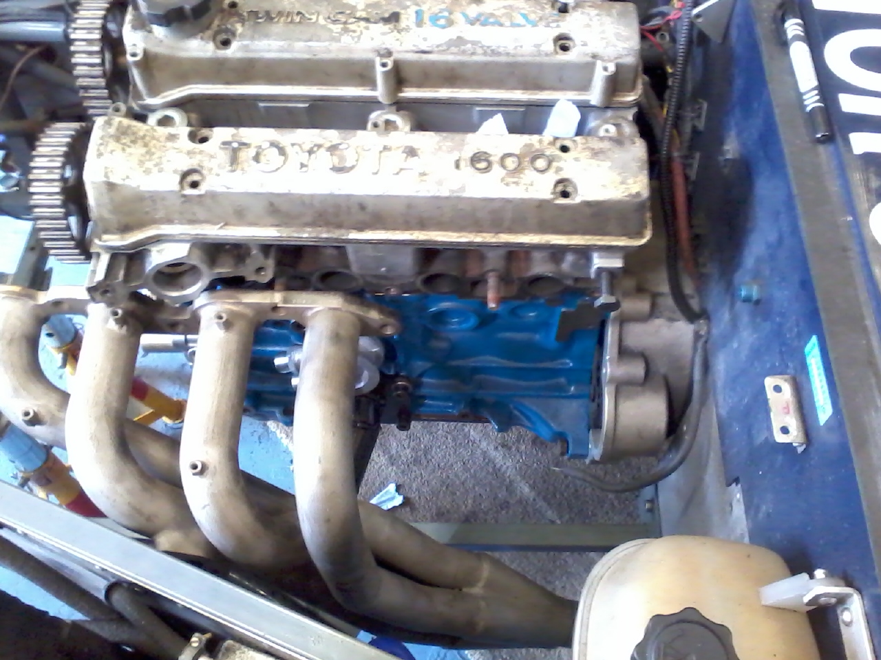 [attachment=2]Photo0056.jpg[/attachment]Getting there - slowly. Engine and box now in the car and no major fouls. With it canted over about 5 deg to the exhaust side the throttle bodies clear OK. Engine and g/box mounts all fabbed up and just about sorted out the coolant pipe runs. Still looking for a propshaft - either need a Ford Rocket splined front end to machine to fit my old Midget prop, or a complete Ford prop to shorten and then machine a PCD adaptor to connect it to the diff flange. Nothing cheap or local so far but there are plenty of new props available for the rally boys if need be. Exhaust will need a lot of cutting and shutting. Usually not a big deal but my fancy stainless TRD manifold to fit a Corolla needs TIG welding so I'll have to enlist outside help once I've worked out what is needed.