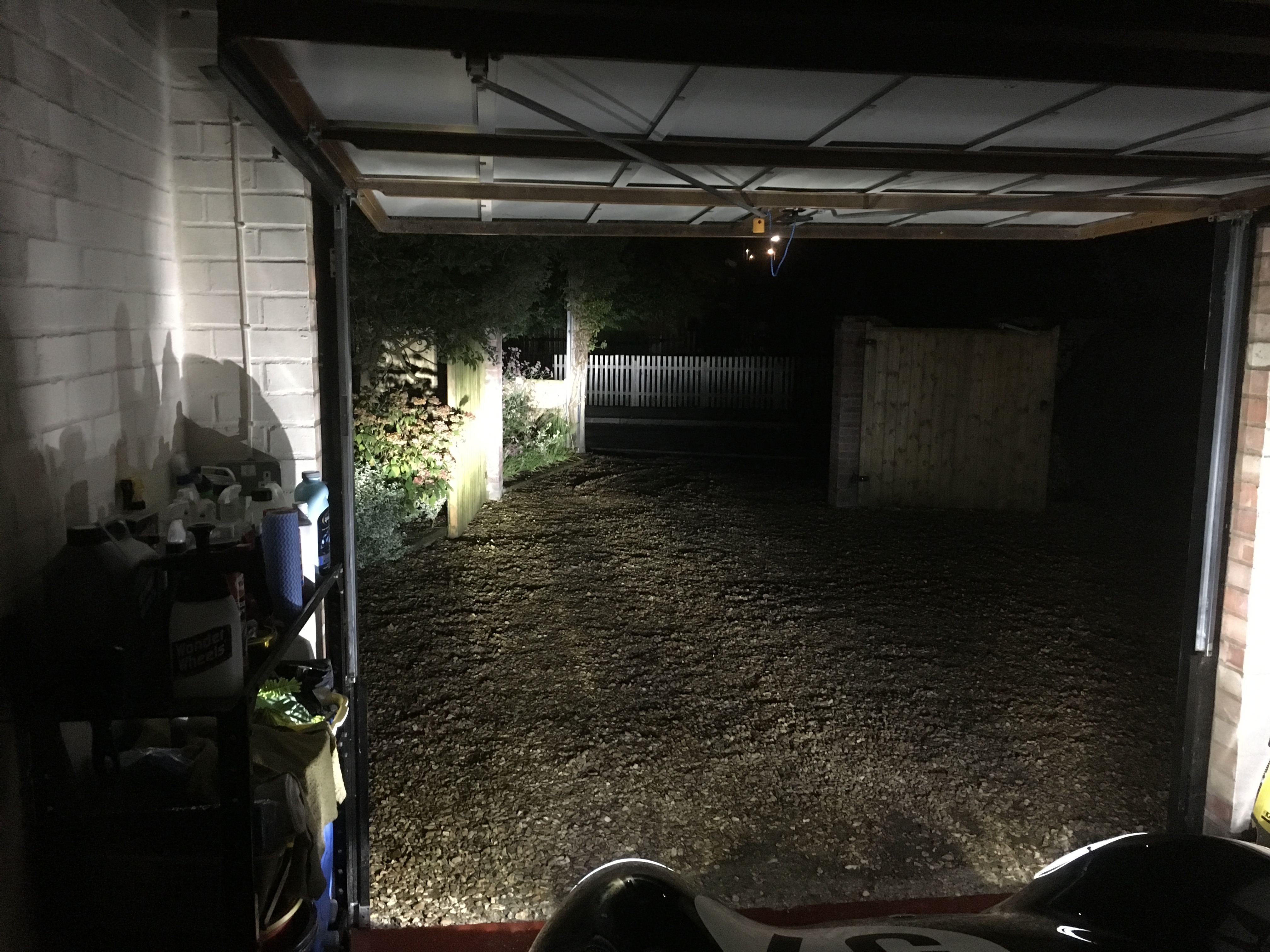 I took the time to tack a dust sheet to my gates and adjust the woefully ill-adjusted lamps (the dipped-beam cut-off should fall 3" below the centreline of the lamps at a distance of 25', etc).