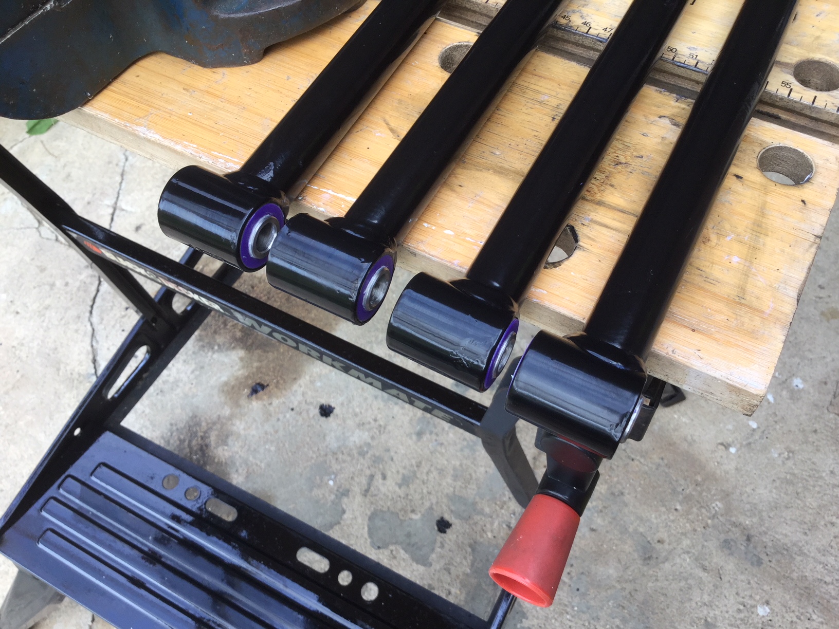 Blimey, that does a LONG way. It poured way quicker than I was expecting when I was decanting into a small aerosol lid. Probably around 60 ml of paint. That covered two coars on the trailing arms, most of the faded coating on my workmate, and the handle on my trolley jack. Still had a load left in my lid, but the light was going....