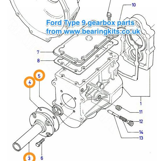 When I first removed the engine, the front of the gearbox didn't match the interweb photos that I was expecting. Seems that by build number five, "Jim" had realised that, so long as he could source the bell housing, he didn't have to buy a 5-speed kit; all the parts being readily available. Except that, as with so much of the hidden oily bits, corners were cut. So the t9 'box in my car had a front cover of the wrong length. That's the piece marked number 3 in the diagram below. It shrouds the input shaft, with the release bearing translating to-and-fro along it. Rather than source one of the correct length for the application, "Jim" had utilised a cover with a tube of minimal length, leaving the input shaft totally exposed. It was a matter of moments to obtain the correct one.