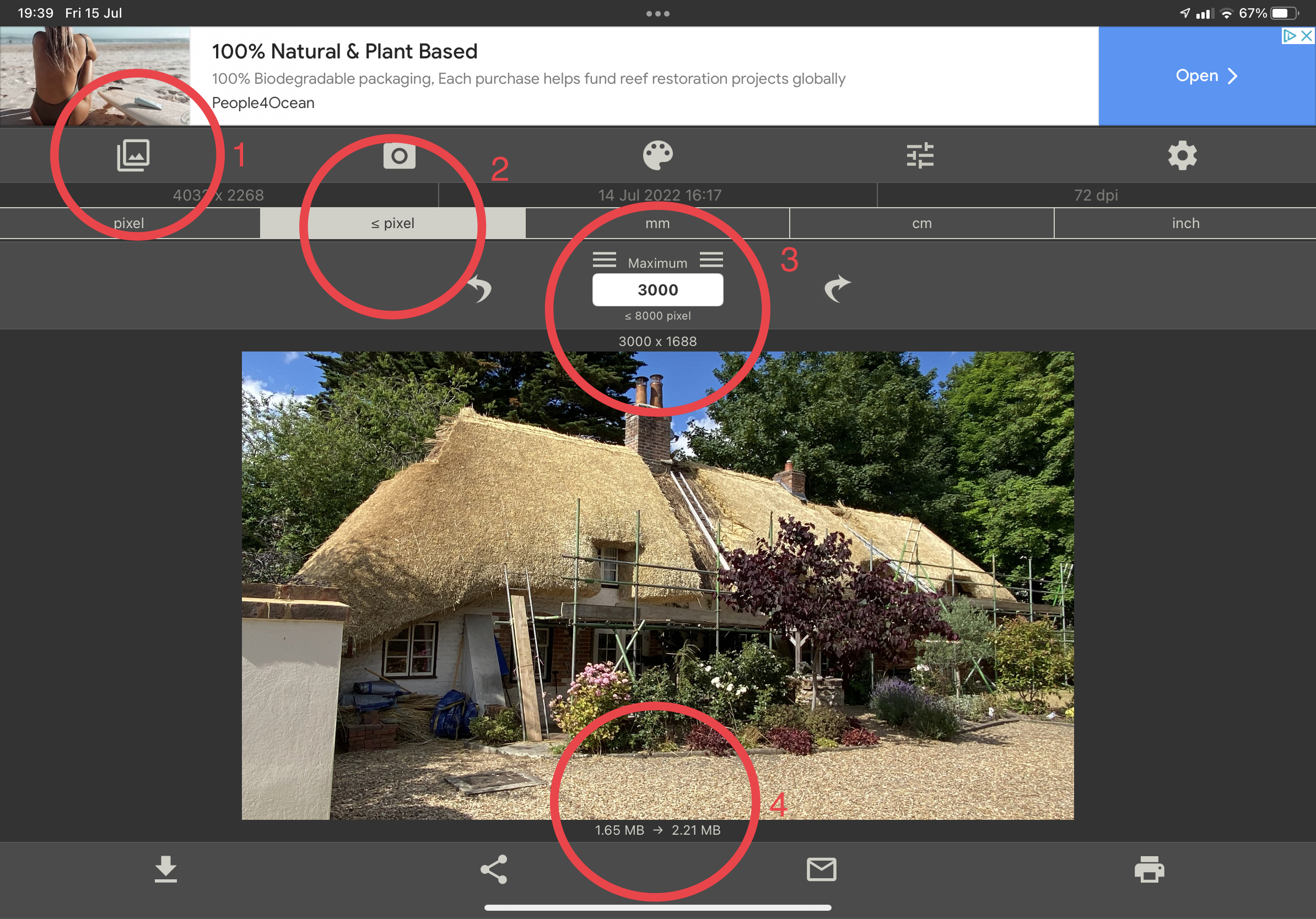 The app offers you several different ways to define HOW you want the image resized. I choose to limit the pixel count (circle #2). Notice that in the image above, I’ve told the app to limit the resize to less than, or equal to, 3000 pixels (circle #3). This has resulted in the app wanting to UPSIZE the file (my cottage, being rethatched!) from 1.65MB to 2.21MB (circle #4). This is obviously no good!