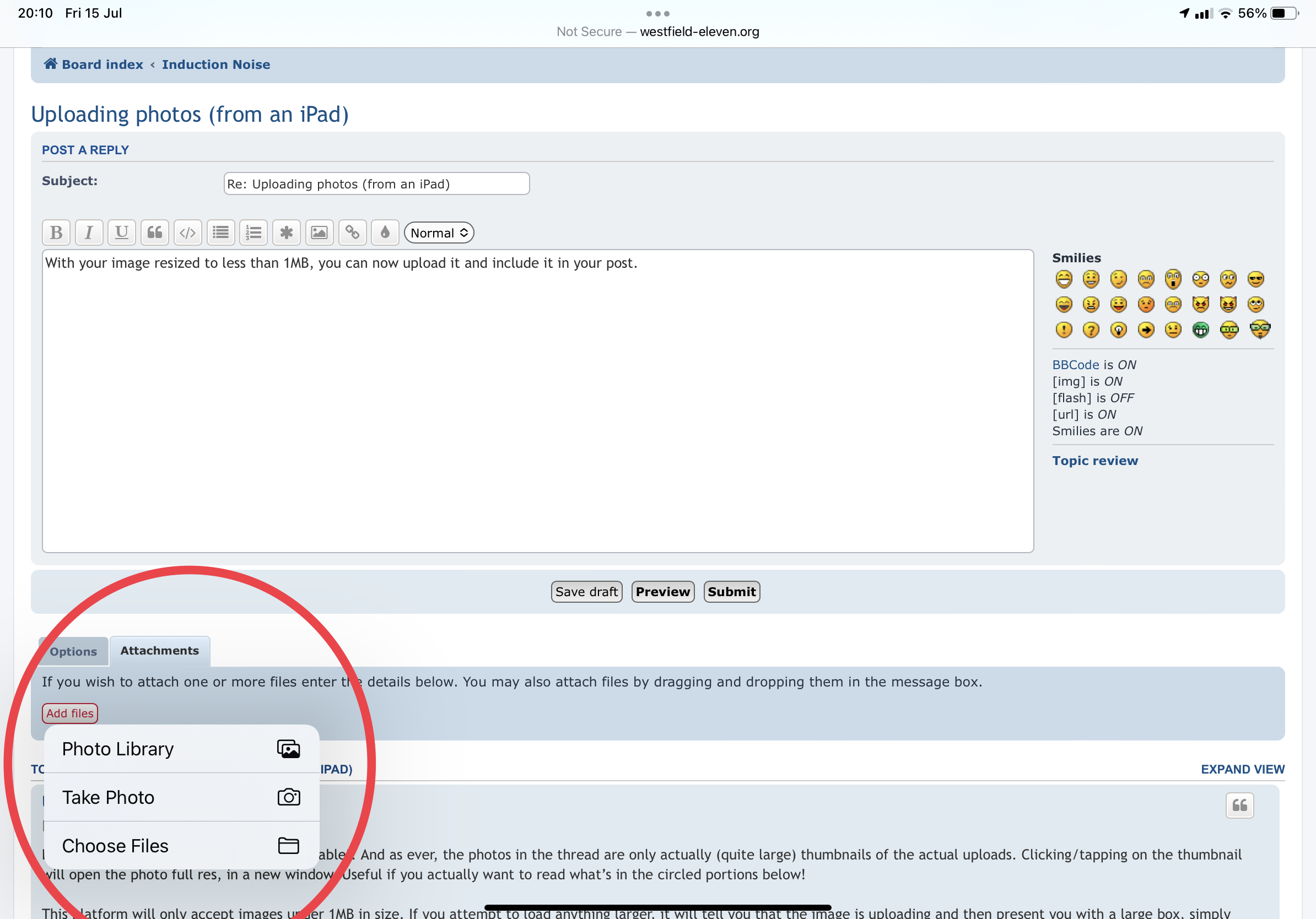 Below the window where you’re typing your text is a button marked “attachments”. Tap this button, followed by the “add file” button that it reveals. This opens you photo album yet again. Click on your resized image (the latest in your photo stream!) and click “choose”. The image will then be uploaded.